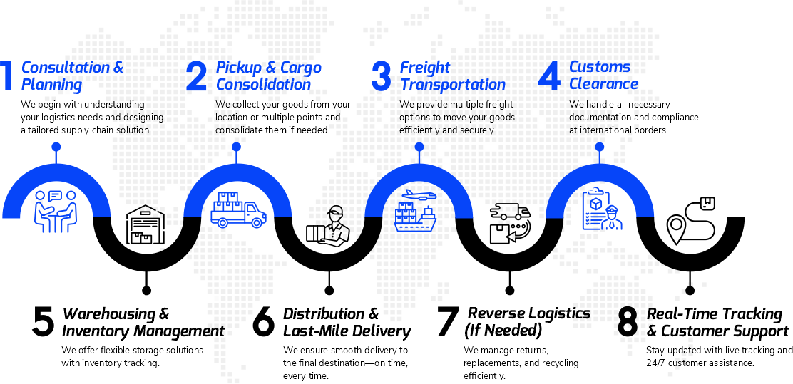 At BonnEx, we specialize in providing seamless international freight forwarding and comprehensive logistics solutions that connect businesses across the globe. With a strong network of trusted partners, advanced technology, and industry expertise, we ensure your cargo moves efficiently by land, sea, and air—on time and within budget. Whether it's a single shipment or a complex supply chain operation, our commitment to reliability, transparency, and customer satisfaction makes us the logistics partner you can depend on, anywhere in the world.